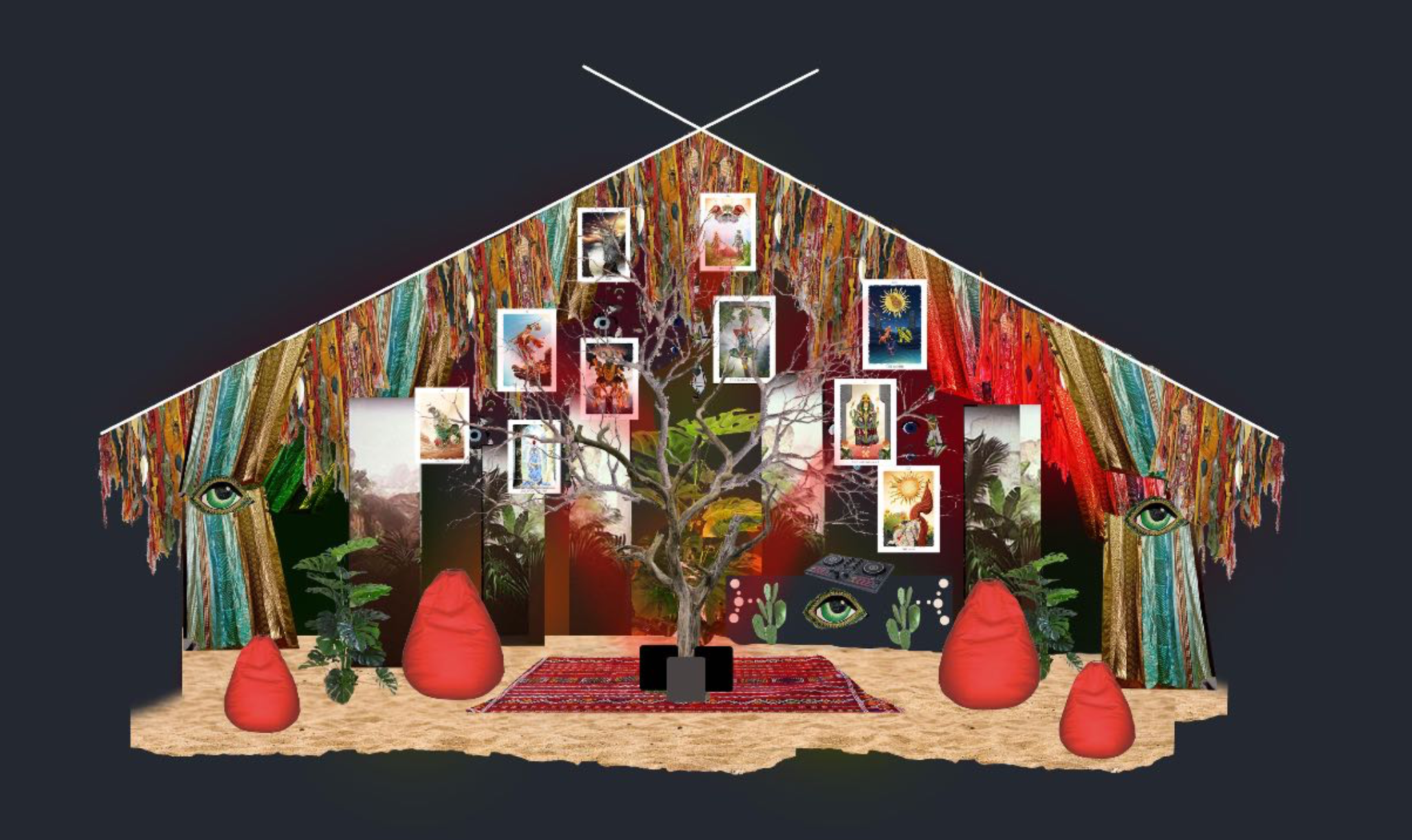 The installation and concept were founded through a tarot deck I created with artist Jeremy Laigneau, "Rooted in Dreams Tarot"— This project spoke about the Fool's journey, the archetype of the brave young adventurer always seeking new realities, always cheerful, always moving forward.