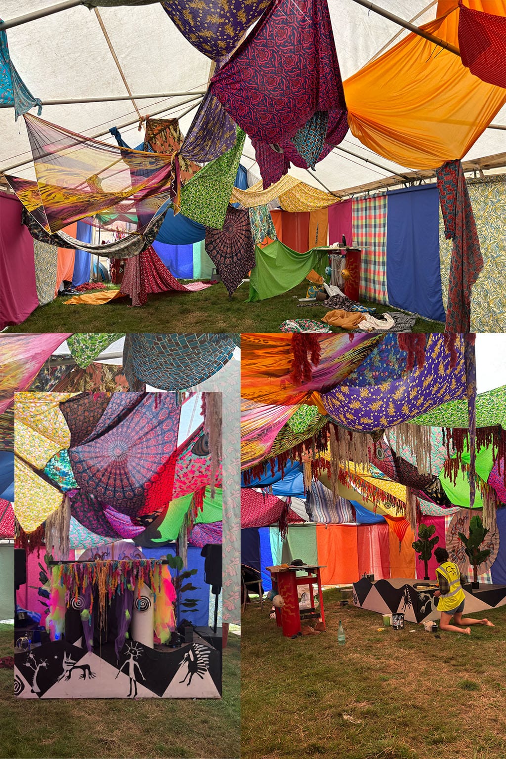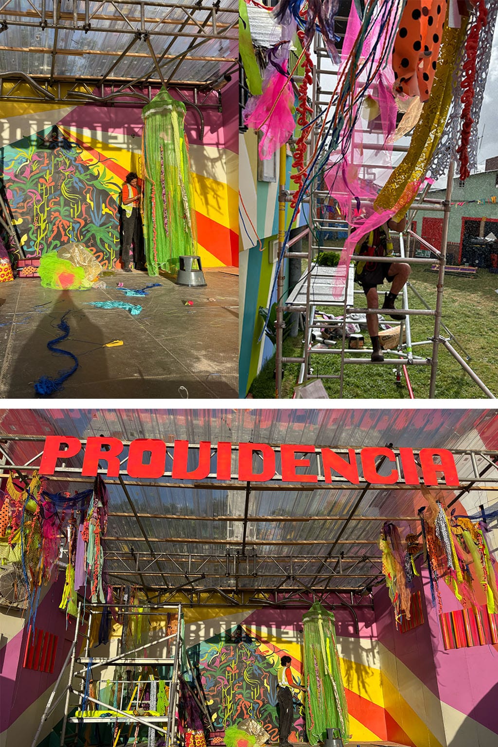 El equipo que Roz y Hugo fueron reuniendo estaba compuesto por los personajes más adorables y entregados. Reinaba un sentido de comunidad y colaboración absoluta: incluso con exceso de trabajo, siempre había una mano amiga. Algunos nombres: Michelle, virtuosa de las manualidades; Yoel, maestro de la electricidad y las estructuras; Fergus, encargado de la seguridad y estructura; Chris y Shane, carpinteros, todos artistas de gran talento; Lu y Duncan, antiguos dueños de Ukiyu, uno de los bares más contemporáneos de cocina japonesa y escena electrónica en Dublín, quienes nos deleitaban con exquisitas bebidas en el backstage de Providencia; y Grace una querida australiana que coordinó el evento de la carpa vecina.